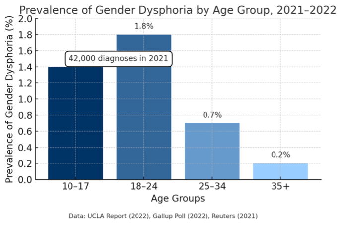 “This chart illustrates the sharp rise in gender dysphoria among adolescents (10–17) and young adults (18–24), with 1.4% and 1.8% prevalence, respectively, compared to just 0.2% in older adults (35+). The 42,000 diagnoses in 2021 for youth underscore the scale of this trend.”